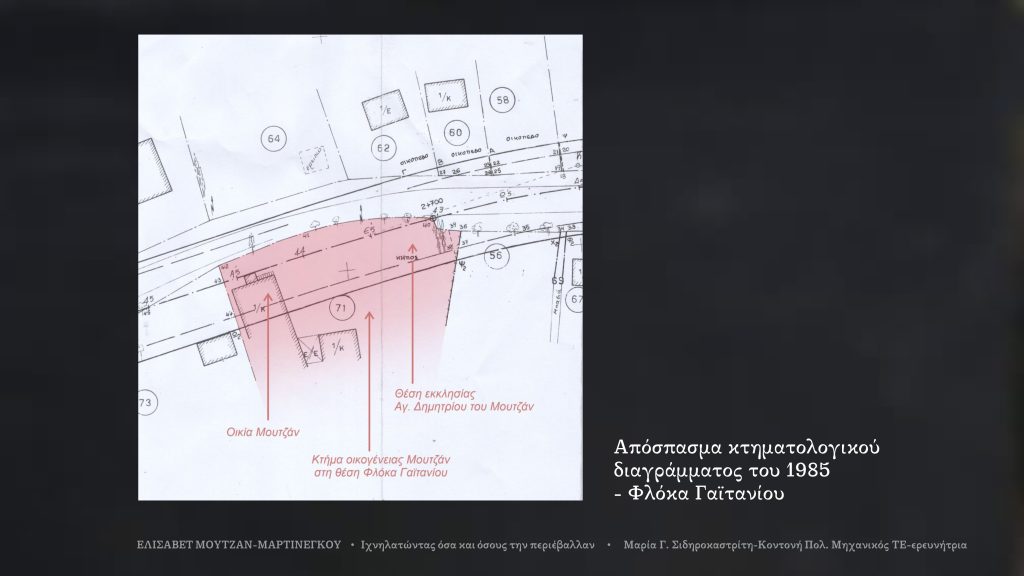 Το μετόχι “στου Φλόκα” στο οποίο ονειρευόταν να αποτραβηχτεί, αφού δεν της επέτρεπαν να ενδυθεί στο μοναχικό σχήμα, είχε όλα όσα επιθυμούσε: “Σπίτι ευρύχωρος εύμορφα στολισμένον, καλή βιβλιοθήκη, εκκλησία εδεκεί σιμά, πεδιάδα δια περίπατον…”. Από όλα αυτά δεν υπάρχει σήμερα τίποτα, τα σκέπασε ο δρόμος Αγίου Λαζάρου Πάστρα που κατασκευάστηκε το 2000 περίπου. Παρουσιάζεται εδώ πιστοποιητικό μεταγραφής του 1948 στο οποίο φαίνεται πως το συγκεκριμένο κτήμα αγοράστηκε από τα παιδιά του Ελισάβετιου Μαρτινέγκου. Σε απόσπασμα κτηματολογικού διαγράμματος του 1985 φαίνεται η θέση οικίας Μουτζάν και πλησίον της στον αναφερόμενο κήπο υπήρξε η εκκλησία του Αγίου Δημητρίου του Δε-Φραντζή, μετέπειτα Μουτζάν. Συνεπώς είναι δυνατόν να προσδιοριστεί με σχετική ακρίβεια η θέση ταφής της Ελισάβετ, η οποία, σύμφωνα με πληροφορίες της οικογένειας τάφηκε στο μετόχι “στου Φλόκα”. Το μόνο που διασώθηκε από ευαίσθητο συμπολίτη μας, ο οποίος έψαξε κυριολεκτικά μέσα στα μπάζα, είναι πλάκα με δικέφαλο αετό που προφανώς ήταν το ομφάλιο του δαπέδου του ναού και ένα αρχιτεκτονικό μέλος. Επίσης διασώθηκε η επιτάφια επιγραφή του εγγονού της Νοικολάου, γιου του Ελισαβέτιου, η οποία φυλάσσεται στο δημοτικό κοιμητήριο Γαϊτανίου.