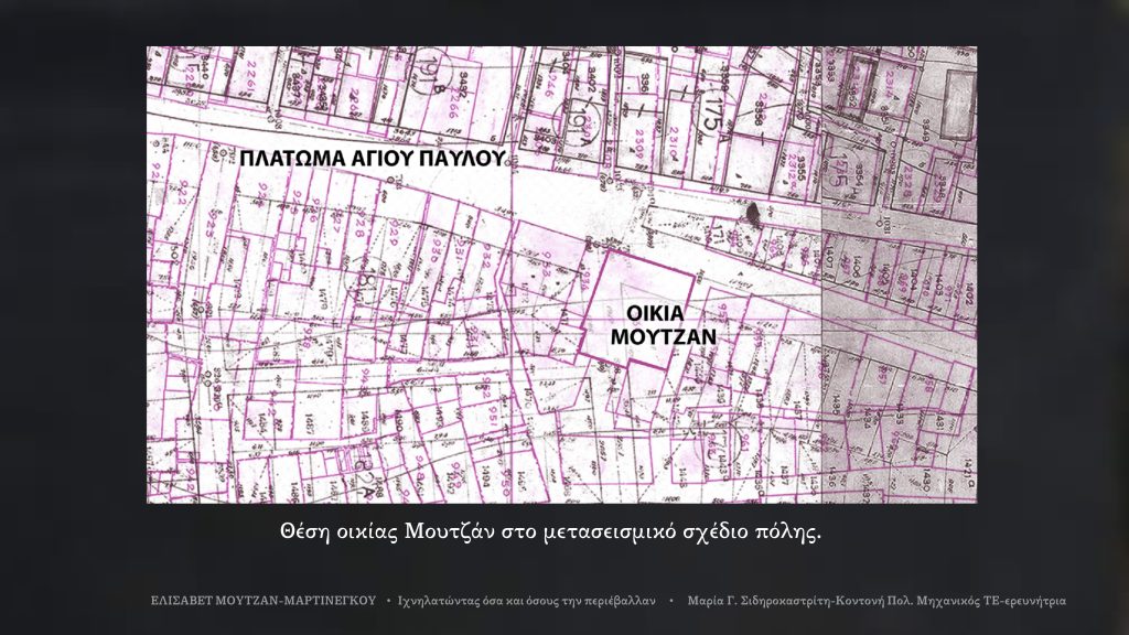 Η Ελισάβετ γεννήθηκε και έζησε μέχρι να παντρευτεί στο πατρικό της, το γεμάτο σκοτάδι όπως το περιγράφει, στην περιοχή του Αγίου Παύλου. Ο Ντίνος Κονόμος αναφέρει, πως αγοράστηκε από τον Τζώρτζη Σαρακίνη (Ν. Κονόμος, Ζάκυνθος – Πεντακόσια Χρόνια 1478-1978, τόμος 2, Καστρόλοφος & Αιγιαλός, Αθήνα 1979, σ. 195), πιθανώς από τους κληρονόμους του. Με αυτό το στοιχείο, μαρτυρίες και έρευνα στην κτηματική ομάδα Ζακύνθου, τοποθετήθηκε το προσεισμικό σχέδιο πόλης πάνω στο σημερινό (Πολεοδομικά σχέδια ευρισκόμενα στη Δ/νση Πολεοδομία Δήμου Ζακύνθου), έχοντας ως σταθερά σημεία το τρίτο Δημοτικό σχολείο του Άμμου που υπάρχει και στα δύο σχέδια πόλης και το παραλιακό κρηπίδωμα και βρέθηκε πως η οικία Μουτζάν ευρίσκετο στην περιοχή Αγίου Παύλου, στο σημείο όπου υπάρχει η διασταύρωση των οδών Ελισάβετ Μουτζάν Μαρτινέγκου και Αντωνίου Μαρτινέγκου, όπως φαίνεται και στο παρουσιαζόμενο σχέδιο.