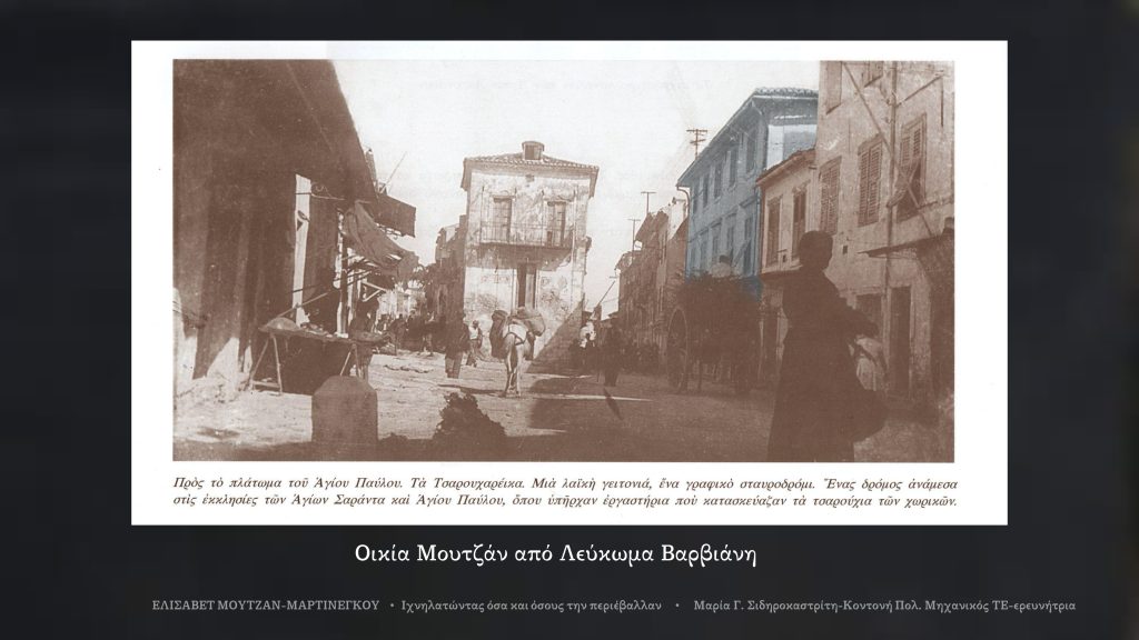Παρουσιάζεται επίσης μια φωτογραφία δημοσιευμένη στο λευκωμα Βαρβιάνη (Νικόλαος Βαρβιάνης, η Ζάκυνθος άλλωτε και τώρα, Ιστορία, Παραδόσεις – Θησαυροί, Λέυκωμα, εκδόσεις Μουσείου Σολωμού και Επιφανών Ζακυνθίων, Αθήνα 1999, εκδόσεις Περίπλους, σ.36) στην οποία έχει σημειωθεί με διαφορετικό χρωματισμό η οικεία Μουτζάν, όπως διατηρείτο στις αρχές του 20ου αιώνα.